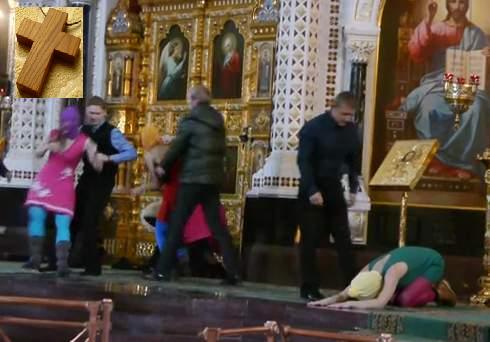 А то что видно - уводят, так же СИЛОЙ, буквально уносят, но ведь никто не пишет про это и не возмущается. Не могут удержать: растерялись. При хорошей работе охраны вообще этой акции в ХХЦ не должно было бы произойти: даже если девочки и прошли в храм, при малейшем подозрении на провокацию, например: идут напролом к алтарю, одевают маски, и прочее, их действия попросту пресекли бы на корню.